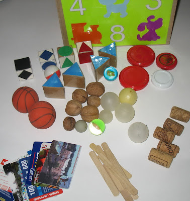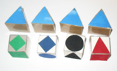 Кубики. Маленькие, сторона квадрата ок.2,5 см, сделаны изначально для изучения цветов и геометрических фигур. Несколько слоев плотного картона, чтоб по размеру получилась и высота 2,5 см, обклеены картоном (местами сероватого оттенка - что нашлось в доме) и на каждой стороне геометрические фигуры из бархатной бумаги, каждый кубик своего цвета. Сначала просто строили башенки маленькие, искали на сторонах одинаковые фигурки, искали кубики заданного цвета.